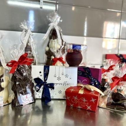 Pour les fêtes, Patrice vous propose un vaste choix de délicatesses chocolatées : pralines (ballotins ou boîtes plates, montages et sujets en tous genres (bonhomme de neige, Père Noël, bouteille de champagne). Chaque assortiment peut évidemment être personnalisé en fonction des goûts de chacun ! Pour vos commandes, n’hésitez pas à contacter Patrice par téléphone ou d’aller lui rendre visite directement en boutique… résultat gustatif garanti !