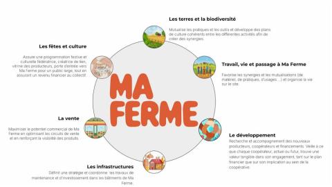 La vision de Ma Ferme est de développer un modèle de ferme coopérative, un lieu de production et d’échange entre investisseurs, producteurs et consommateurs autour de pratiques nourricières durables.
