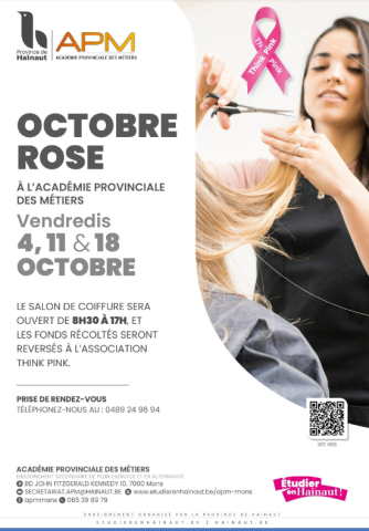 A Mons, la section Coiffure de l’Académie Provinciale des Métiers de Mons se mobilise pour soutenir l'association Think Pink. À cette occasion, le salon ouvrira ses portes au public les vendredis 4, 11 et 18 octobre, de 8h30 à 17h. Tous les fonds récoltés lors de ces journées seront intégralement reversés à l'organisation nationale de lutte contre le cancer du sein.