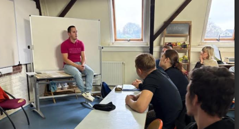 En pleine promotion de son livre "J'arrête quand je veux", le voici, après le CEFA Wapi, au Lycée provincial des Sciences et des technologies de Soignies.