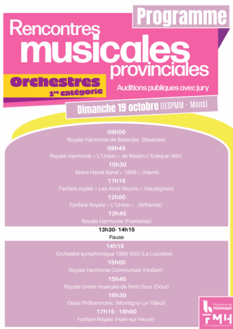 Hainaut Culture et la Fédération Musicale du Hainaut vous invitent à ce rendez-vous artistique qui met, cette année, à l’honneur les harmonies, fanfares et orchestres classés en 1ʳᵉ catégorie.