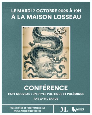 Infos : entrée par la porte en verre au 39, rue de Nimy à Mons , 065 398 880, reservations.losseau@gmail.com, https://www.maisonlosseau.be/event/artnouveau-politique-et-polemique/