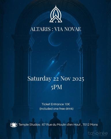 Infos : Temple Studios, rue du Moulin d’en haut 67 à 7012 Mons, social@altaris.org, https://my.weezevent.com/altaris-via-novae..