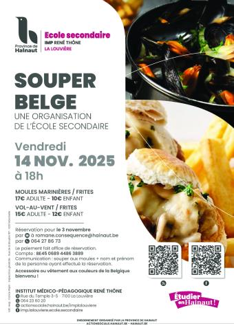 L’Institut Médico-Pédagogique René Thône à La Louvière vous convie au souper belge organisé par l’école secondaire le vendredi 14 novembre 2025 à 18h.