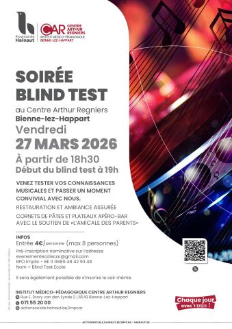 Infos : IMP Centre Arthur Régnier, rue E .Drory van den Eynde 2 à Bienne-Lez-Happart, 071/55 20 00, evenementecolecar@gmail.com, https://actionsociale.hainaut.be/agenda/event/soiree-blind-test/