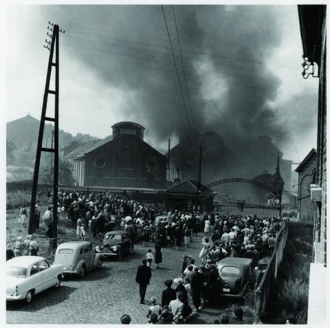 Charbonnage du Bois du Cazier. Arrivé rapidement sur place, Camille Detraux a immortalisé ces instants tragiques avec une première photo montrant les fumées s’échappant du puits ainsi que la grille où commençait à se presser la foule. Pris de l’étage d’une habitation de la rue du Cazier, ce document entamait