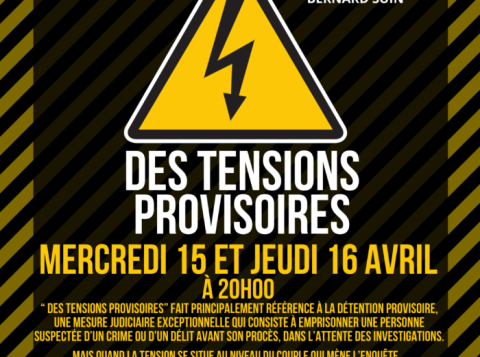 “ Des tensions provisoires” fait principalement référence à la détention provisoire, une mesure judiciaire exceptionnelle qui consiste à emprisonner une personne suspectée d’un crime ou d’un délit avant son procès, dans l’attente des investigations. Mais quand la tension se situe au niveau du couple qui mène l’enquête … les tensions seront-elles provisoires ou pas? Derrière les rires se cachent bien des choses vécues par beaucoup …” A voir les 15 et 16 avril à 20h à Anderlues.