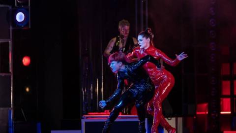 Philippe Decouflé nous invite à un grand show dont il a le secret, époustouflant et explosif. Sur scène, parés de tenues flamboyantes, sept danseurs-comédiens-performeurs et trois musiciens se mêlent jusqu’à la fusion. Le trio guitare-basse-batterie donne la mesure avec une partition de rêve qui convie, entre autres, les Beatles, T. Rex et Queens of the Stone Age.