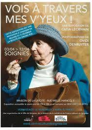 Catia Lecrivain, sonégienne, est en cours reconversion professionnelle et suit actuellement une dernière année de bachelier comme éducatrice spécialisée en psychologie et éducation. Son travail de fin d’année porte sur le projet « Vois à travers mes V’yeux ! » qui a pour but final de créer une exposition photographique dont le message est « Le vieillissement est trop souvent associé à la fragilité, à la dépendance ou à l’invisibilité sociale. » Pourtant, vieillir est un processus universel et un état riche de sens, de mémoire et de beauté.