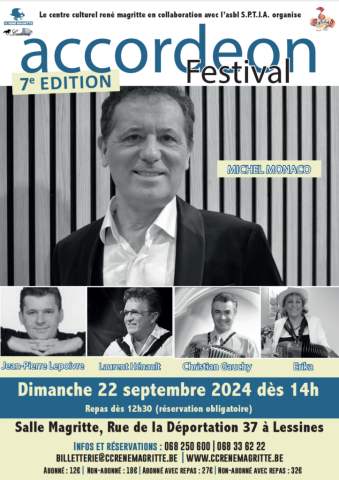 Pour cette 7e édition du festival d’accordéon, le CCRM, la Commission du Temps Disponible et l’ASBL S.P.T.J.A sont fiers d’accueillir Michel Monaco, chanteur romantique de la TV, Jean-Pierre Lepoivre, Laurent Hénault, Christian Gauchy et Erika, la princesse de l’accordéon.