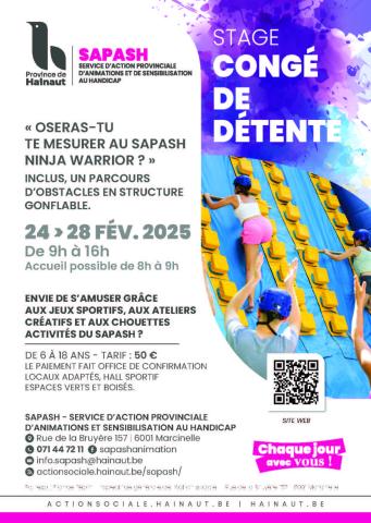Infos : Site provincial de Marcinelle (bâtiment D). 157, rue de la Bruyère à 6001 Marcinelle. Tél. : 071/44.72.11 info.sapash@hainaut.be. Modalités de participation : de 6 à 18 ans. tarif : 50€ Du 24 au 28 février, de 9h à 16h. Accueil possible de 8h à 9h.