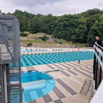 -Une piscine de 50 mètres permettant aux sportifs de haut de niveau de s’entraîner en plein air en matinée et aux familles d’en prendre possession dès 10h30 le matin en toute sécurité car la profondeur n’exède pas 1,80 mètre.