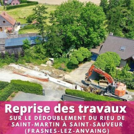Après un arrêt de plusieurs semaines, dû à la présence de câblage sur le chantier, Hainaut Ingénierie Technique reprend les travaux d'amélioration sur le dédoublement du Rieu de Saint-Martin à Saint-Sauveur (Frasnes-lez-Anvaing).