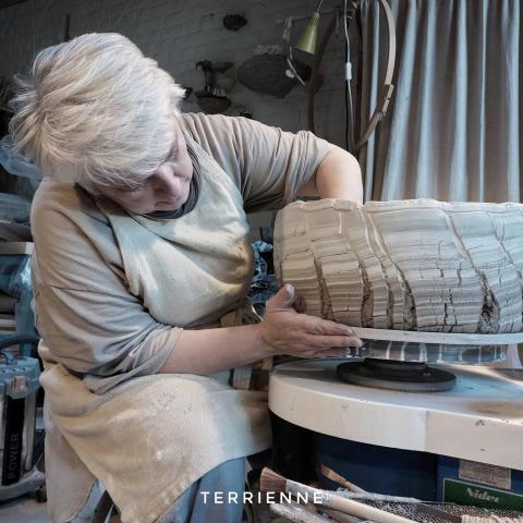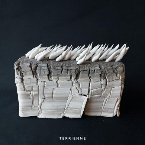 A 45 ans, elle a ouvert son atelier TERRIENNE, affirmant pleinement son identité de céramiste, son lien profond à la terre et à la condition humaine. Ses œuvres évoquent des formes que l’on croit reconnaître : fragments de paysages, parois rocheuses, réminiscences marines, insectes ou structures végétales.