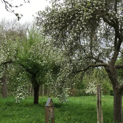 Les premières abeilles installées sont sélectionnées pour leur douceur et permettent le butinage et donc la fécondation des fleurs des arbres fruitiers ; pommiers, poiriers et cerisiers. Le verger contient de vieux arbres hautes tiges avec des cavités, idéales pour les insectes et les oiseaux. Depuis 3 ans, nous plantons des nouveaux fruitiers.