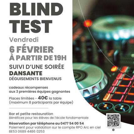 L'école fondamentale de l'IMP René Thône vous invite chaleureusement à sa soirée Blind Test. Cet événement festif se déroulera le vendredi 6 février prochain à Marcinelle. Les festivités débuteront dès 19 heures au réfectoire de notre établissement provincial. Le programme prévoit un grand jeu musical suivi d'une ambiance dansante dynamique. Nous encourageons vivement les participants à porter leurs plus beaux déguisements pour l'occasion. Les trois meilleures équipes de la compétition recevront des récompenses spéciales. Le prix est fixé à 40 euros pour une table de huit personnes maximum. Tous les bénéfices serviront à financer les projets pédagogiques des élèves de l'école. Un bar ainsi qu'une petite restauration seront accessibles durant toute la soirée. Pour participer, merci de réserver votre table par téléphone au numéro 0477 54 00 54. La validation définitive s'effectue par virement bancaire sur le compte de l'association Arc en ciel. Nous avons hâte de vous retrouve r pour ce moment de partage, d'amusement et de solidarité. Au profit des projets scolaires des élèves de l'école fondamentale.