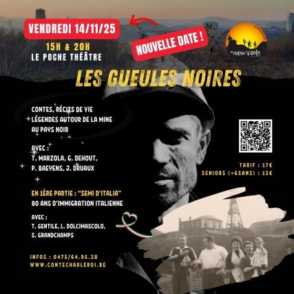 14/11/2025 > 14/11/2025 15:00 > 22:00 Poche Théâtre - Rue du Fort, 70 - Charleroi 0475/64.95.38 maisonducontecharleroi@gmail.com https://www.contecharleroi.be/agenda/?fbclid=IwY2xjawNR4tlleHRuA2FlbQIxMABicmlkETBJSkFZU3NPM2dVTG96d29EAR6xWLYmFVOnP3jaWOSOfeiXoC9uO2XVnPJEO1KknbWb0OZ-SNlCcdjnMRnayA_aem_KtBuWYXnVz037TiqQq0s9g Partagez Spectacle Les Gueules Noires #2 Agenda Spectacle Les Gueules Noires #2